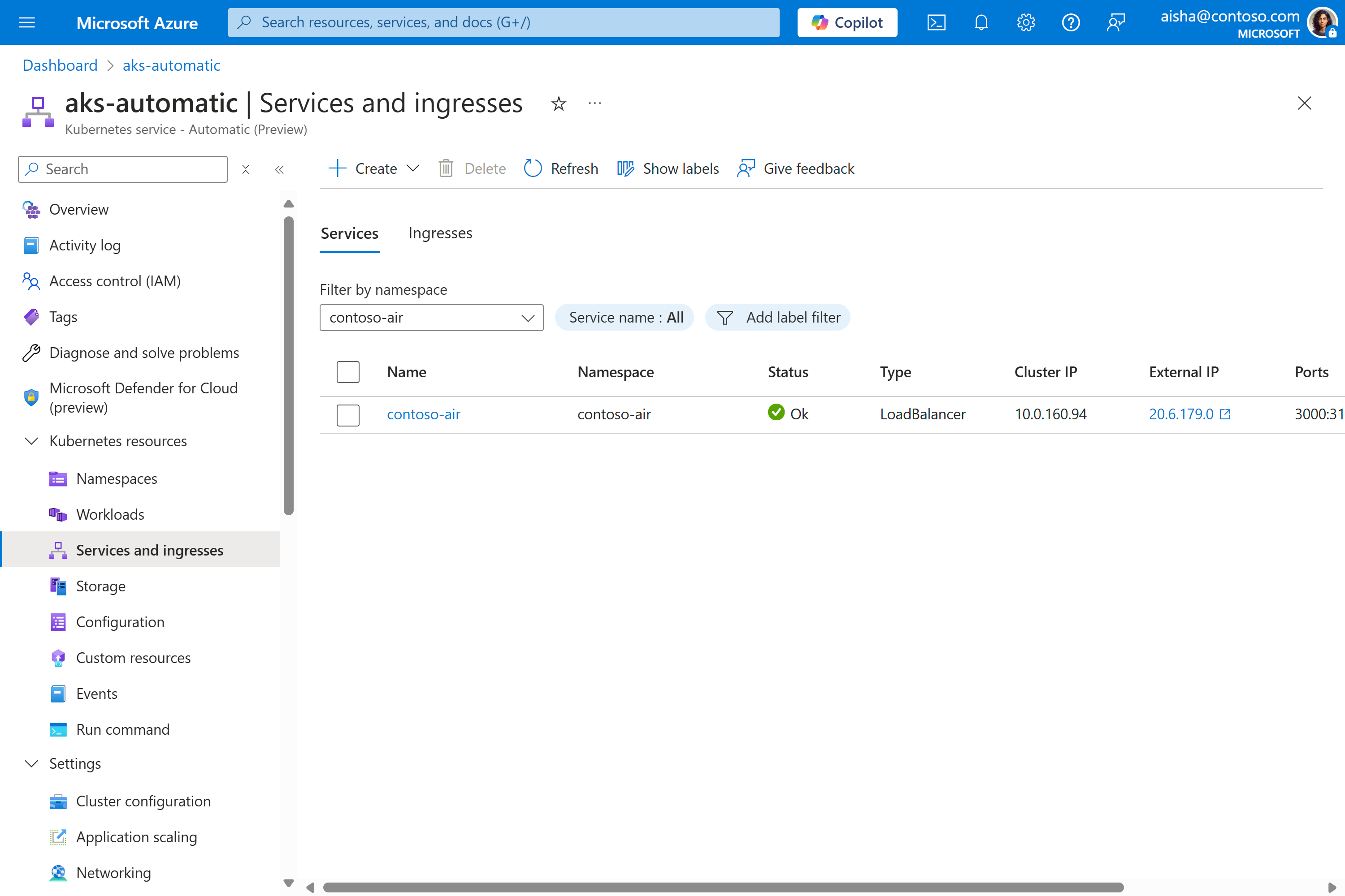 Nachdem die Pipeline abgeschlossen wurde, können Sie die erstellten Kubernetes-Service im Azure Portal überprüfen, indem Sie Services und Ingresses unter dem Abschnitt Kubernetes resources des Dienstmenüs auswählen.