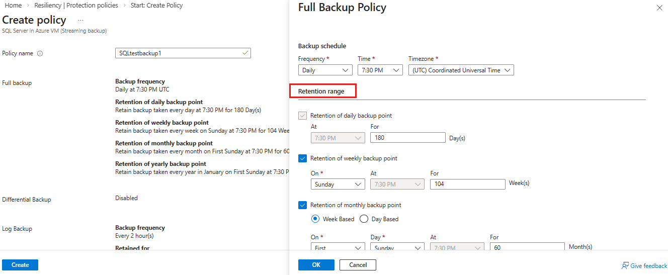 - Wählen Sie unter Richtlinie für differenzielle Sicherung die Option Aktivieren aus, um die Einstellungen für Häufigkeit und Beibehaltung vorzunehmen.