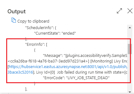 Wählen Sie die Schaltfläche Eingabe oder Ausgabe aus, um die Eingaben oder Ausgaben der Notebookaktivität anzuzeigen. Wenn in Ihrer Pipeline ein Benutzerfehler auftritt, können Sie Ausgabe auswählen. Im Feld Ergebnis ist eine ausführliche Rückverfolgung des Benutzerfehlers vorhanden.