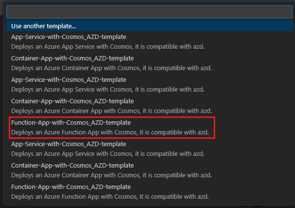 Wählen Sie in der Liste der Vorlagen Function-App-with-Cosmos_AZD-template aus.