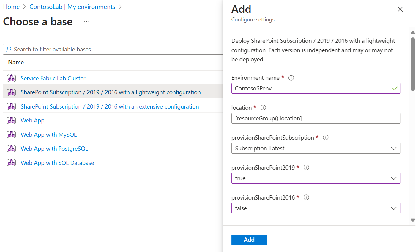 Wählen Sie Hinzufügen aus. Die Umgebungsbereitstellung wird sofort gestartet.