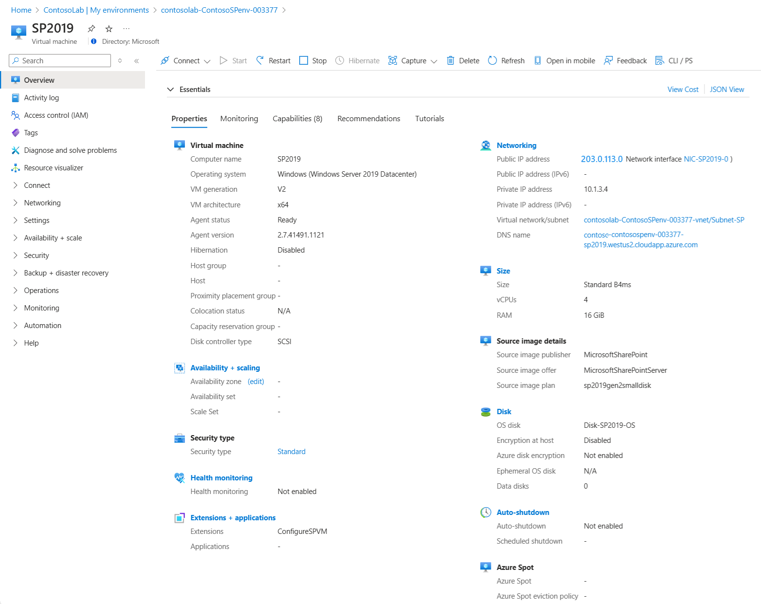 Wählen Sie in der Liste einen virtuellen Computer (VM) aus, um VM-Eigenschaften und verfügbare Aktionen anzuzeigen, z. B. Verwalten von Konfiguration, Zeitplänen und Richtlinien.