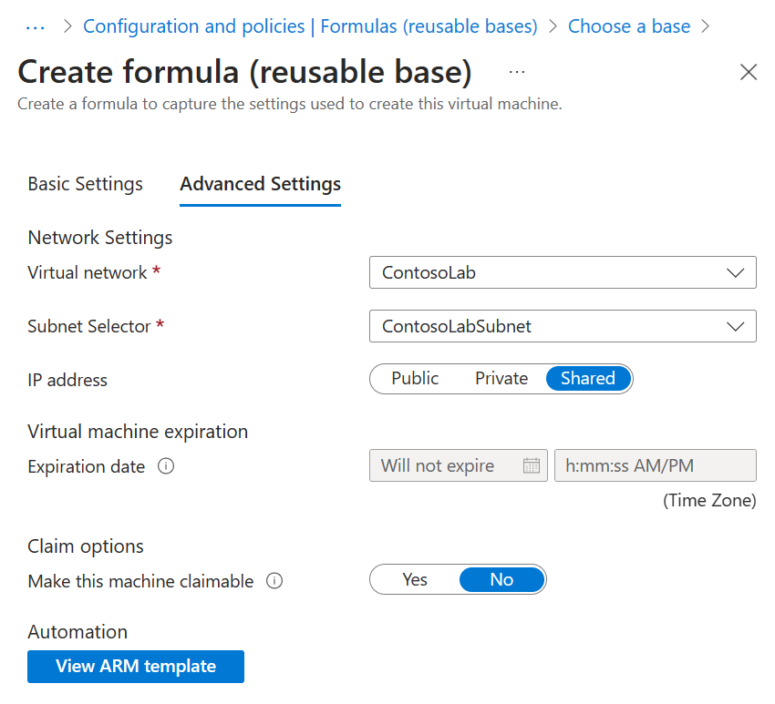 - Anhand einer Basis: Erstellen Sie eine Formel anhand einer Basis, und definieren Sie alle Konfigurationseinstellungen für die Formel. Dieser Ansatz unterstützt Marketplace-Images und Images in einem Katalog freigegebener Images, der an das Lab angefügt ist.