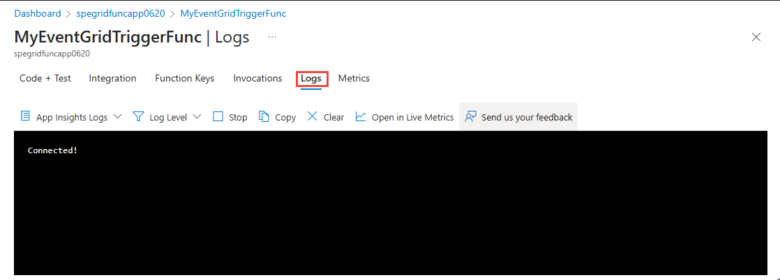 Invoke-WebRequest-Cmdlet, um das Ereignis zu senden:Invoke-WebRequest -Uri $endpoint -Method POST -Body $body -Headers @{"aeg-sas-key" = $keys.Key1}Vergewissern Sie sich, dass die Nachricht aus der Funktion auf der Registerkarte Protokolle Für Ihre Funktion im Azure-Portal angezeigt wird.