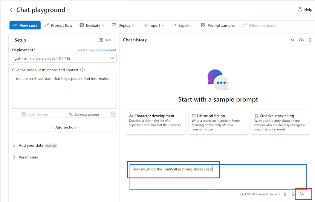 Bereitstellen (oder Wiederverwenden) eines Chatmodells und Senden von Eingabeaufforderungen zum Empfangen von KI-generierten Antworten.