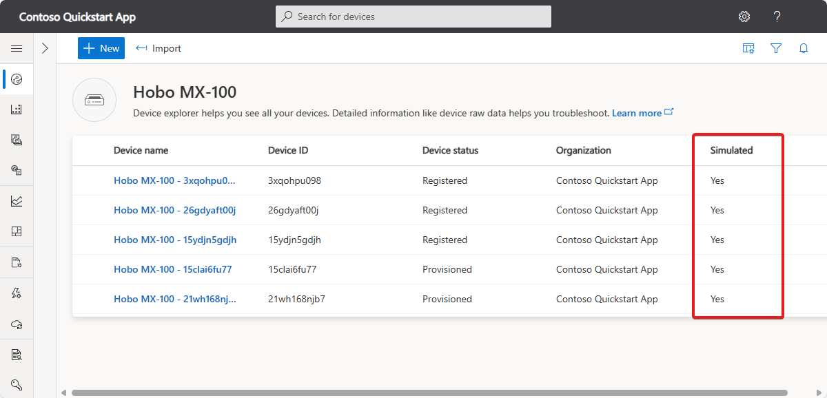 Fügen Sie vor dem Erstellen einer Gerätegruppe mindestens fünf simulierte Geräte auf der Grundlage der Gerätevorlage Hobo MX-100 hinzu, um sie in diesem Tutorial zu verwenden: