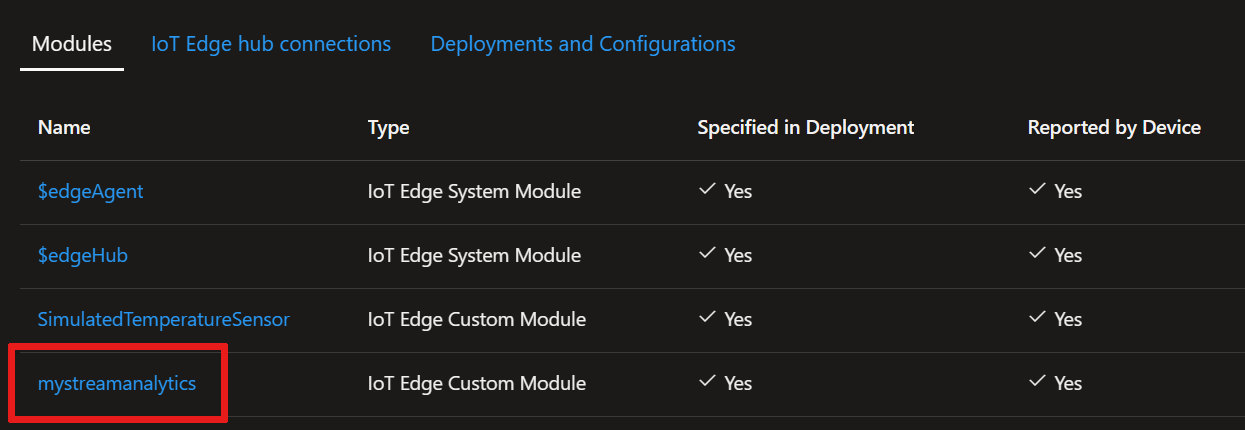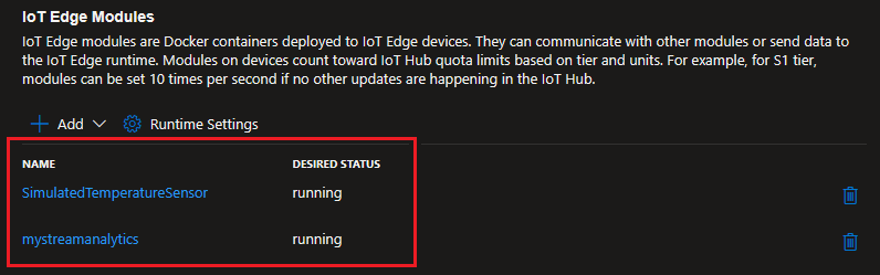 {moduleName}durch den Namen Ihres Azure Stream Analytics Moduls. Dieses Modul sollte den gleichen Namen haben, den Sie in der Modulliste Ihres Geräts auf der Seite Setmodule sehen, wie im Azure-Portal dargestellt.Name Wert TelemetrieInDieCloud FROM /messages/modules/SimulatedTemperatureSensor/* INTO $upstreamalertsToCloud FROM /messages/modules/{moduleName}/* INTO $upstreamalertsToReset FROM /messages/modules/{moduleName}/* INTO BrokeredEndpoint("/modules/SimulatedTemperatureSensor/inputs/control")telemetryToAsa FROM /messages/modules/SimulatedTemperatureSensor/* INTO BrokeredEndpoint("/modules/{moduleName}/inputs/temperature")Die hier deklarierten Routen definieren den Datenfluss über das IoT Edge Gerät. Die Telemetriedaten von SimulatedTemperatureSensor werden an IoT Hub und an die temperatureeingabe gesendet, die im Stream Analytics-Auftrag konfiguriert wurde. Die ausgabemeldungen alert werden an IoT Hub und an das SimulatedTemperatureSensor-Modul gesendet, um den Zurücksetzungsbefehl auszulösen.