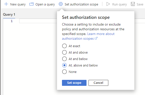 Wählen Sie Autorisierungsbereich festlegen aus, und legen Sie den Autorisierungsbereich auf Bei, oberhalb oder unterhalb fest, um alle Ressourcen im angegebenen Bereich abzufragen.