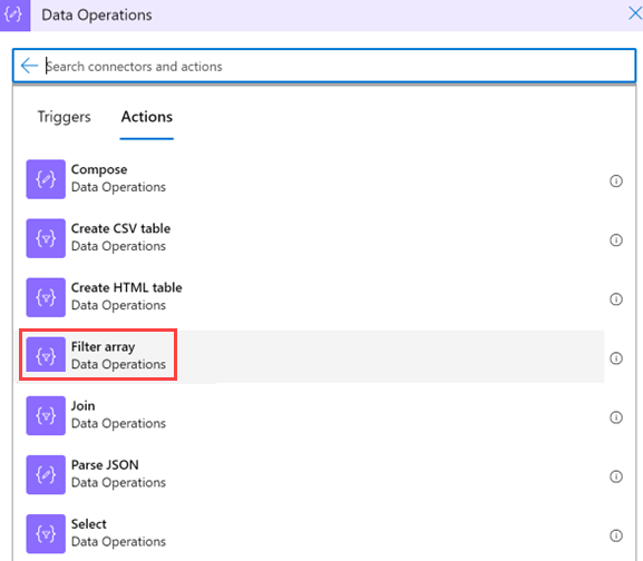 Geben Sie unter Aktion auswählen im Suchfeld Filterarray als Filter ein. Wählen Sie in der Aktionsliste die Option Datenvorgänge aus.