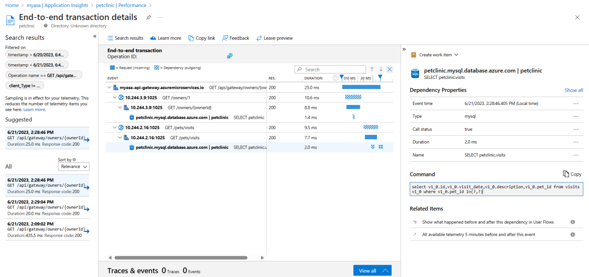 GET /api/gateway/owners/{ownerId}-Vorgang aus. Wählen Sie anschließend 3 Beispiele aus, um die Details anzuzeigen, und wählen Sie dann das vorgeschlagene Beispiel aus.Navigieren Sie zur Seite End-to-End-Transaktionsdetails, um den vollständigen Aufrufstapel im rechten Bereich anzuzeigen.