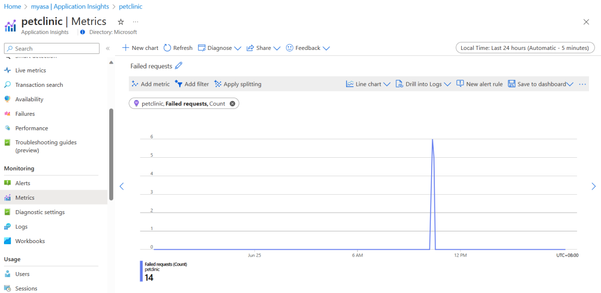 Azure Spring Apps bietet standardmäßig mehrere Metriken – einschließlich Metriken zu Verfügbarkeit, Leistung, HTTP-Anforderungen, Datenbankverbindungen und Ähnlichem. Diese Metriken sind wichtig, um Ziele zu klären, Verbesserungen zu finden und spezifische Verbesserungsmaßnahmen zu formulieren. Weitere Informationen finden Sie unter Metriken für Azure Spring Apps.