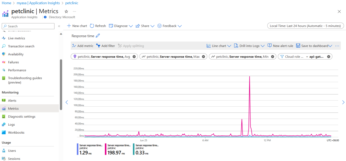 Verwenden Sie zum Anheften des Diagramms „Antwortzeit“ die gleichen Schritte wie zum Anheften des Diagramms „Verfügbarkeit“. Fügen Sie jedoch einen Filter hinzu, um Cloudrollenname mit api-gateway zu filtern. Die Metrik Serverantwortzeit befindet sich unter dem Namespace Application Insights-Standardmetriken.