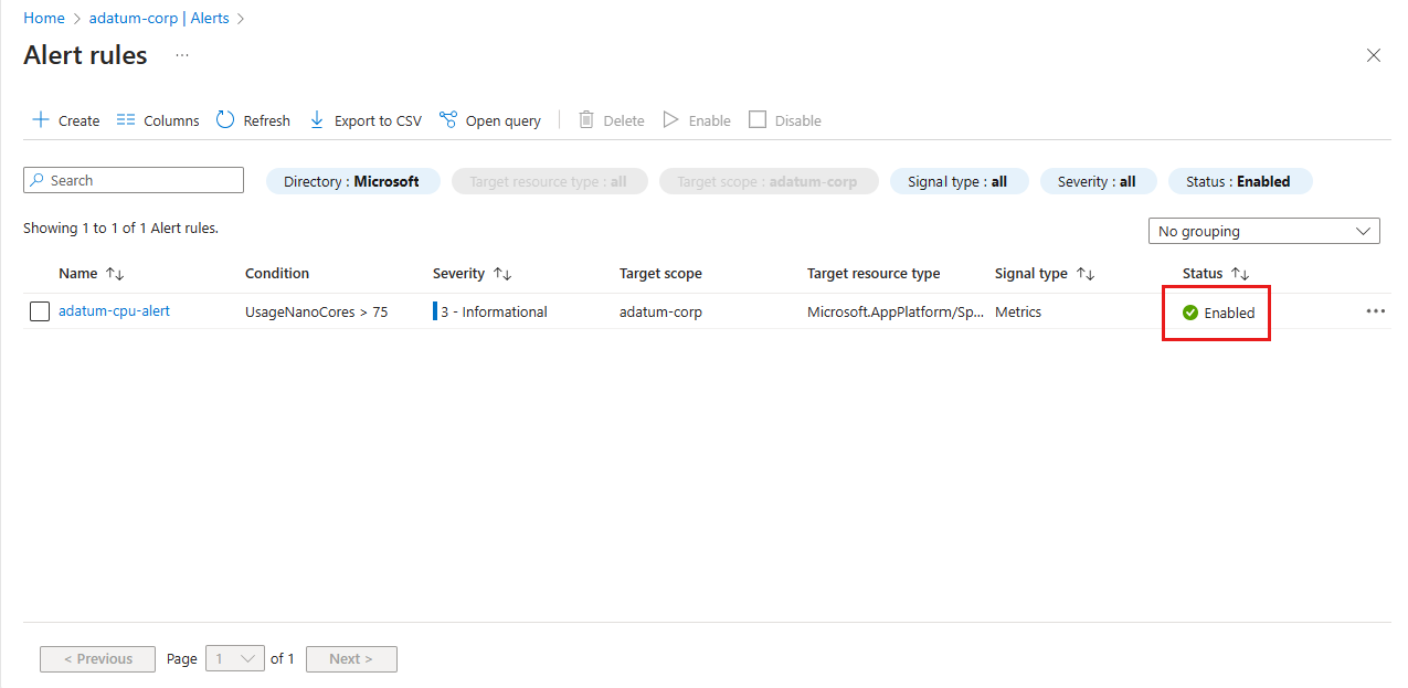 Überprüfen Sie auf der Seite Warnungsregeln, ob die neue Warnungsregel aktiviert ist.