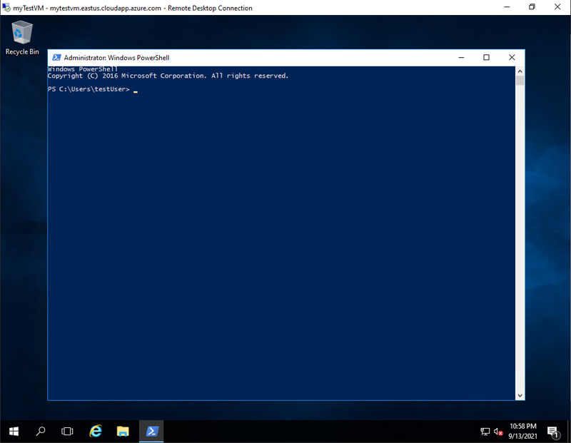 Nach dem Herstellen einer RDP-Verbindung mit dem virtuellen Remotecomputer wählen Sie das Windows-Startmenü aus. Geben Sie PowerShell in das Suchfeld ein, und wählen Sie Windows PowerShell aus, um ein PowerShell-Fenster zu öffnen.