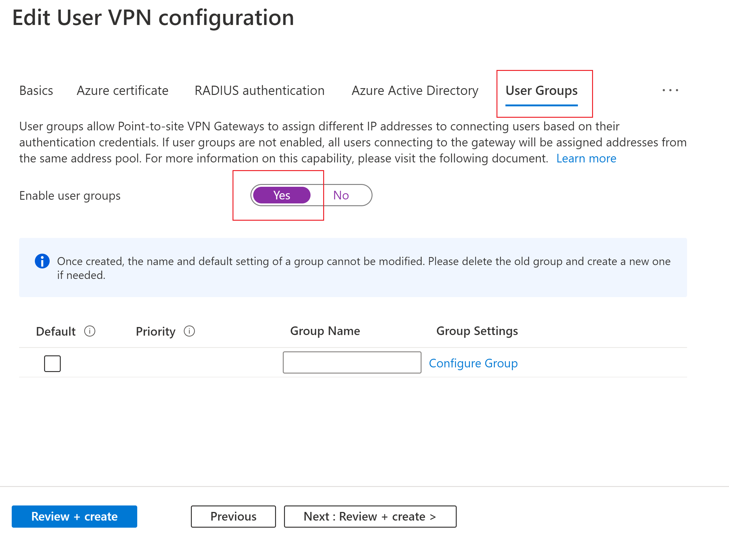 Wählen Sie Überprüfen + Erstellen aus, um die Erstellung und Konfiguration abzuschließen. Nachdem Sie die Benutzer-VPN-Konfiguration erstellt haben, konfigurieren Sie die Konfigurationseinstellungen des Gatewayservers für die Nutzung des Features für Benutzergruppen.