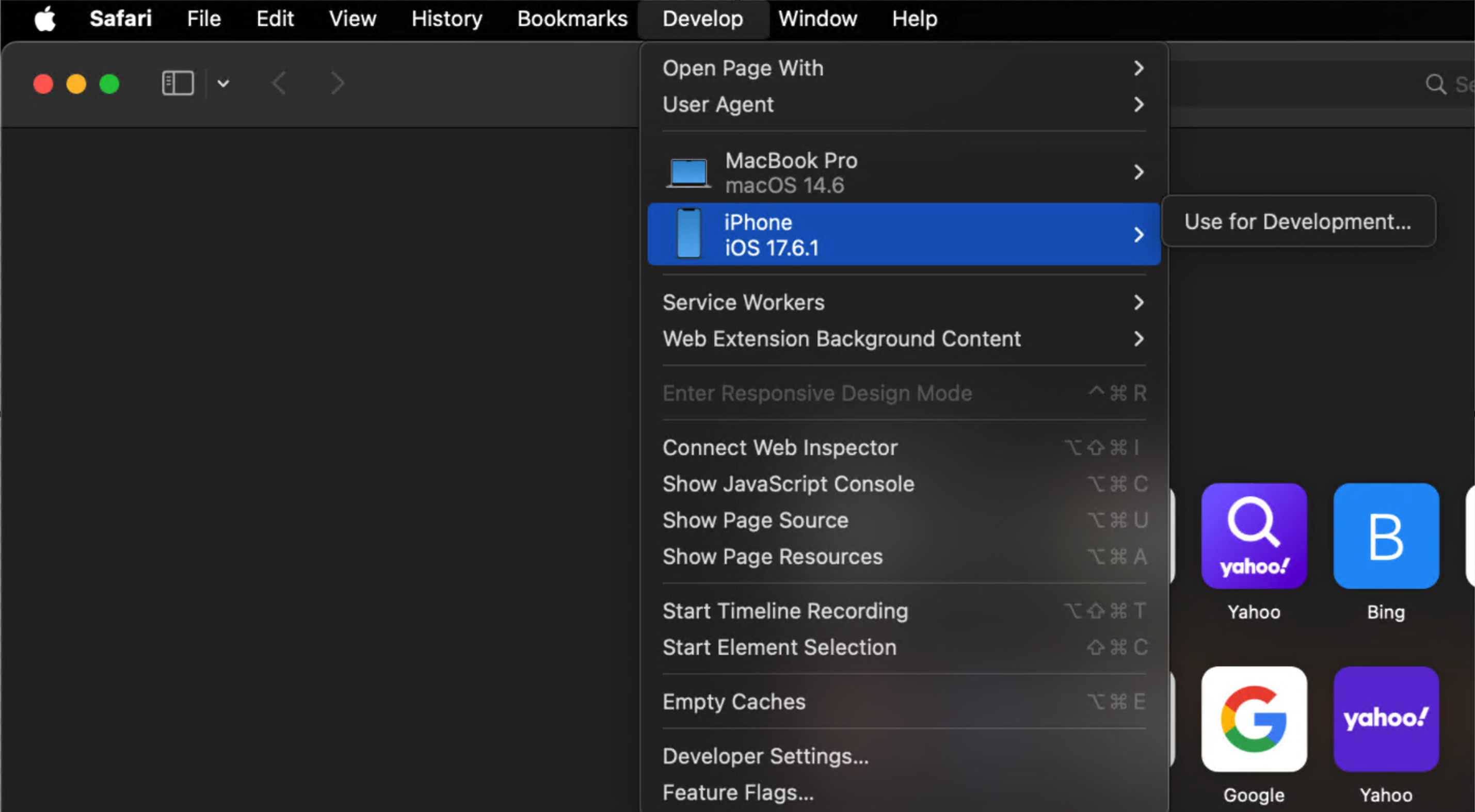 Wählen Sie auf dem Mac-System im Safari-Menü Entwickeln die Option Für Entwicklung verwenden... für Ihren iOS-Client aus. Dies ist eine einmalige Einstellung, die Sie bei der ersten Verwendung von Safari für den Zugriff auf DevTools für den iOS-Client konfigurieren.