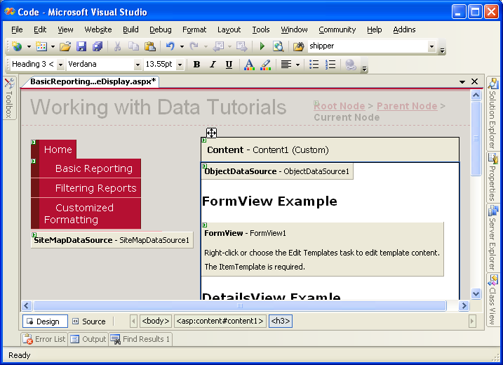 Öffnen Sie zunächst die SimpleDisplay.aspx Seite im BasicReporting Ordner, wechseln Sie zur Entwurfsansicht, und ziehen Sie dann ein ObjectDataSource-Steuerelement aus der Toolbox auf die Entwurfsoberfläche der Seite. Die ObjectDataSource wird als graues Feld auf der Entwurfsoberfläche angezeigt, da sie kein Markup erzeugt. Er greift einfach auf Daten zu, indem er eine Methode aus einem angegebenen Objekt aufruft. Die von einer ObjectDataSource zurückgegebenen Daten können von einem Datenwebsteuerelement angezeigt werden, z. B. GridView, DetailsView, FormView usw.