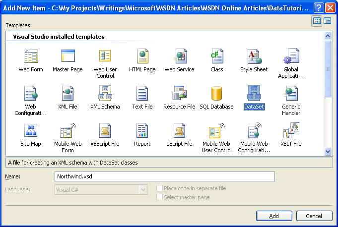 Um mit der Erstellung unseres DAL zu beginnen, fügen wir zunächst ein typisiertes DatenSet zu unserem Projekt ein. Klicken Sie dazu im Projektmappen-Explorer mit der rechten Maustaste auf den Projektknoten, und wählen Sie "Neues Element hinzufügen" aus. Wählen Sie die DataSet-Option aus der Liste der Vorlagen aus, und nennen Sie sie "Northwind.xsd".