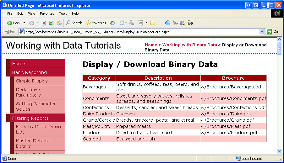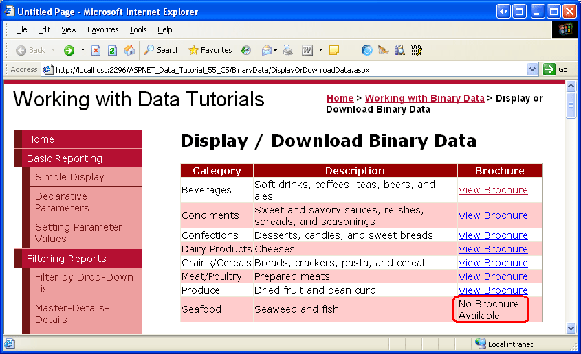 Zeigen Sie diese Seite über einen Browser an (siehe Abbildung 5). Jede der acht Kategorien wird aufgelistet. Die sieben Kategorien mit BrochurePath-Werten zeigen den BrochurePath-Wert im entsprechenden BoundField an. Meeresfrüchte, die einen NULL Wert für ihren BrochurePath haben, zeigen eine leere Zelle an.