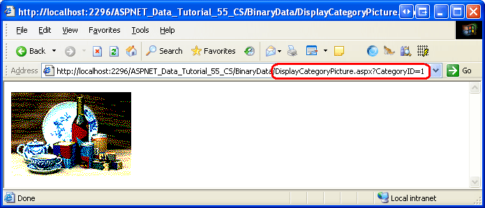 Da nun eine Webseite zum Anzeigen eines bestimmten Kategoriebilds vorhanden ist, können wir es mithilfe des Bildwebsteuerelements oder eines HTML-Elements <img> anzeigen, das DisplayCategoryPicture.aspx?CategoryID=categoryIDauf das Bild zeigt. Bilder, deren URL durch Datenbankdaten bestimmt wird, können in GridView oder DetailsView mithilfe des ImageField angezeigt werden. Das ImageField enthält DataImageUrlField und DataImageUrlFormatString Eigenschaften, die wie hyperLinkFields DataNavigateUrlFields und DataNavigateUrlFormatString Eigenschaften funktionieren.