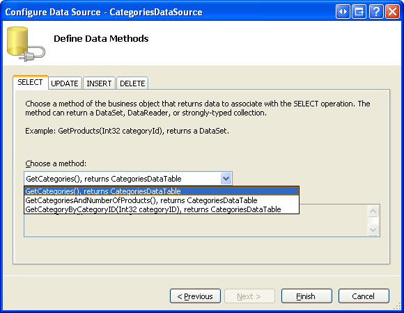 Abbildung 3: Konfigurieren der ObjectDataSource für die Verwendung der CategoriesBLL Klasse (Klicken, um das Bild in voller Größe anzuzeigen)