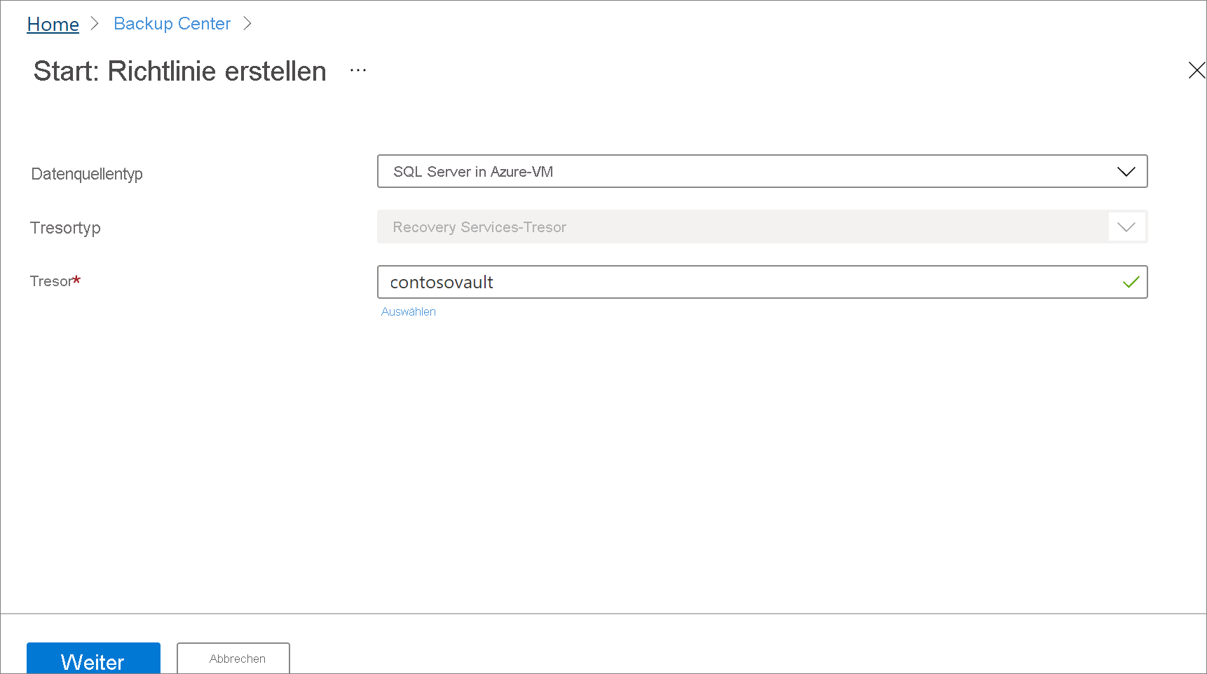 Wählen Sie im Bereich "Start: Richtlinie erstellen " sql Server in Azure VM als Datenquellentyp aus, wählen Sie den Tresor aus, unter dem die Richtlinie erstellt werden soll, und wählen Sie dann "Weiter" aus.