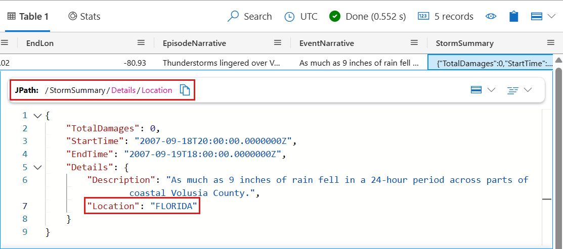 StormSummarySpalte aus, bei der es sich um die letzte Spalte handelt.Wählen Sie verschiedene Felder innerhalb des Ergebnisses aus, und sehen Sie, wie sich das JPATH oben im Fenster ändert. Der folgende Screenshot zeigt beispielsweise den Pfad zum