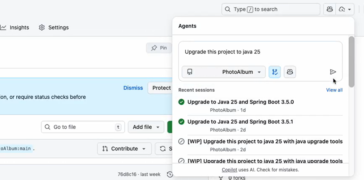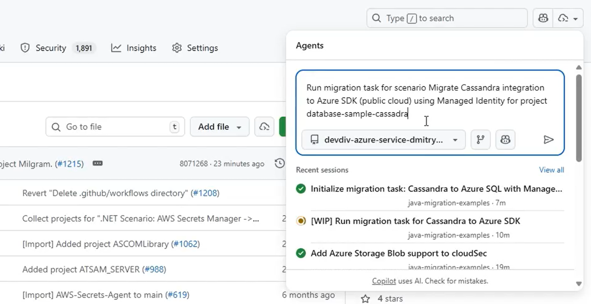 Öffnen Sie den Bereich "Agents " in der oberen rechten Ecke, und geben Sie Ihre Eingabeaufforderung ein. Nachdem die Eingabeaufforderung eingegeben wurde, startet Copilot eine neue Sitzung und öffnet eine neue Pullanforderung, die in der Liste unterhalb des Eingabeaufforderungsfelds angezeigt wird. Copilot arbeitet an der Aufgabe und fügt Sie dann als Prüfer hinzu, wenn es fertig ist, wodurch eine Benachrichtigung ausgelöst wird.