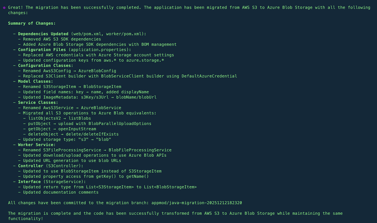 /agentim interaktivem Modus aus oder rufen Sie es direkt in einer Eingabeaufforderung auf.Use the modernization agent to migrate this application from S3 to Azure Blob Storage.