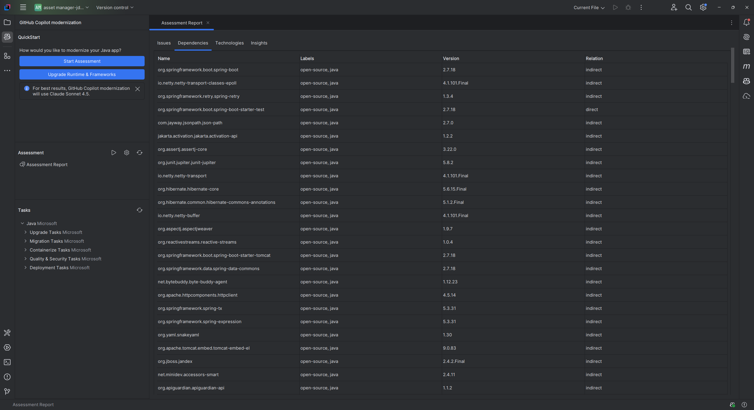 Neben der direkten Ausführung der Bewertung in GitHub Copilot-Modernisierung können Sie auch Bewertungsberichte importieren. Die Berichte können aus AppCAT CLI-Ergebnissen stammen – z report.json. B. einen GitHub Copilot-Modernisierungsexportbericht oder eine App-Kontextdatei von Dr. Migrate.