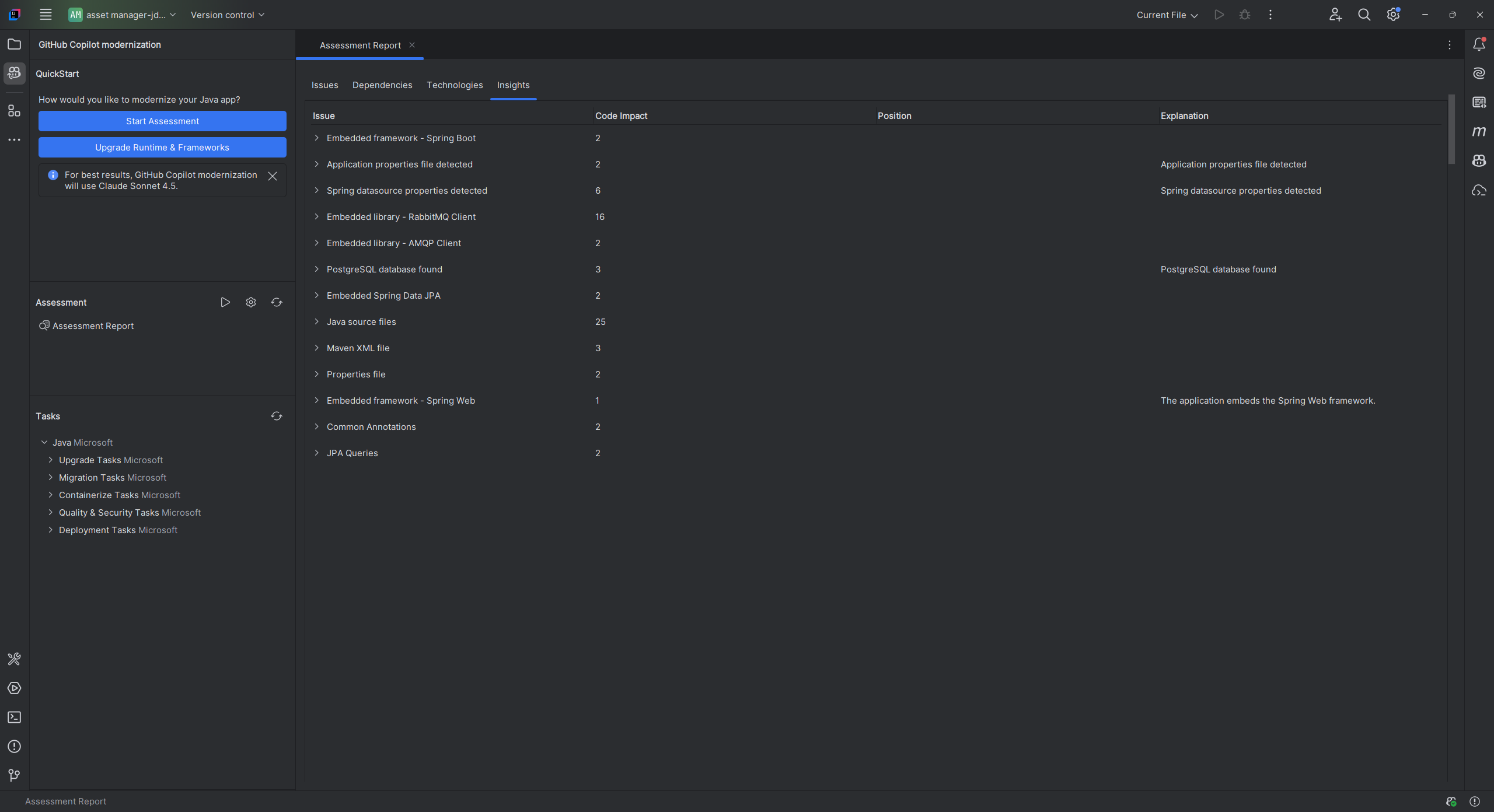 - Anwendungsinformationen: Grundlegende Informationen zu Ihrer Anwendung, einschließlich Java-Version, Frameworks, Buildtools und Projektstruktur.