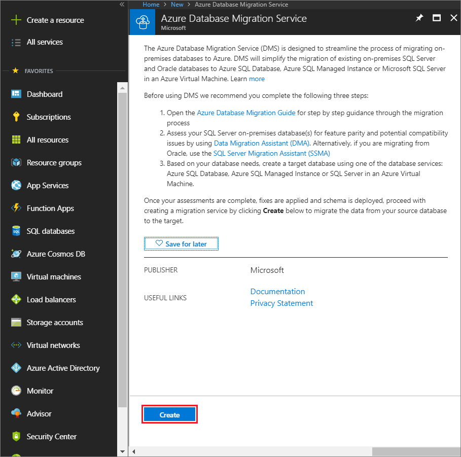 Wählen Sie auf dem Bildschirm Azure Database Migration Service die Schaltfläche Erstellen aus.