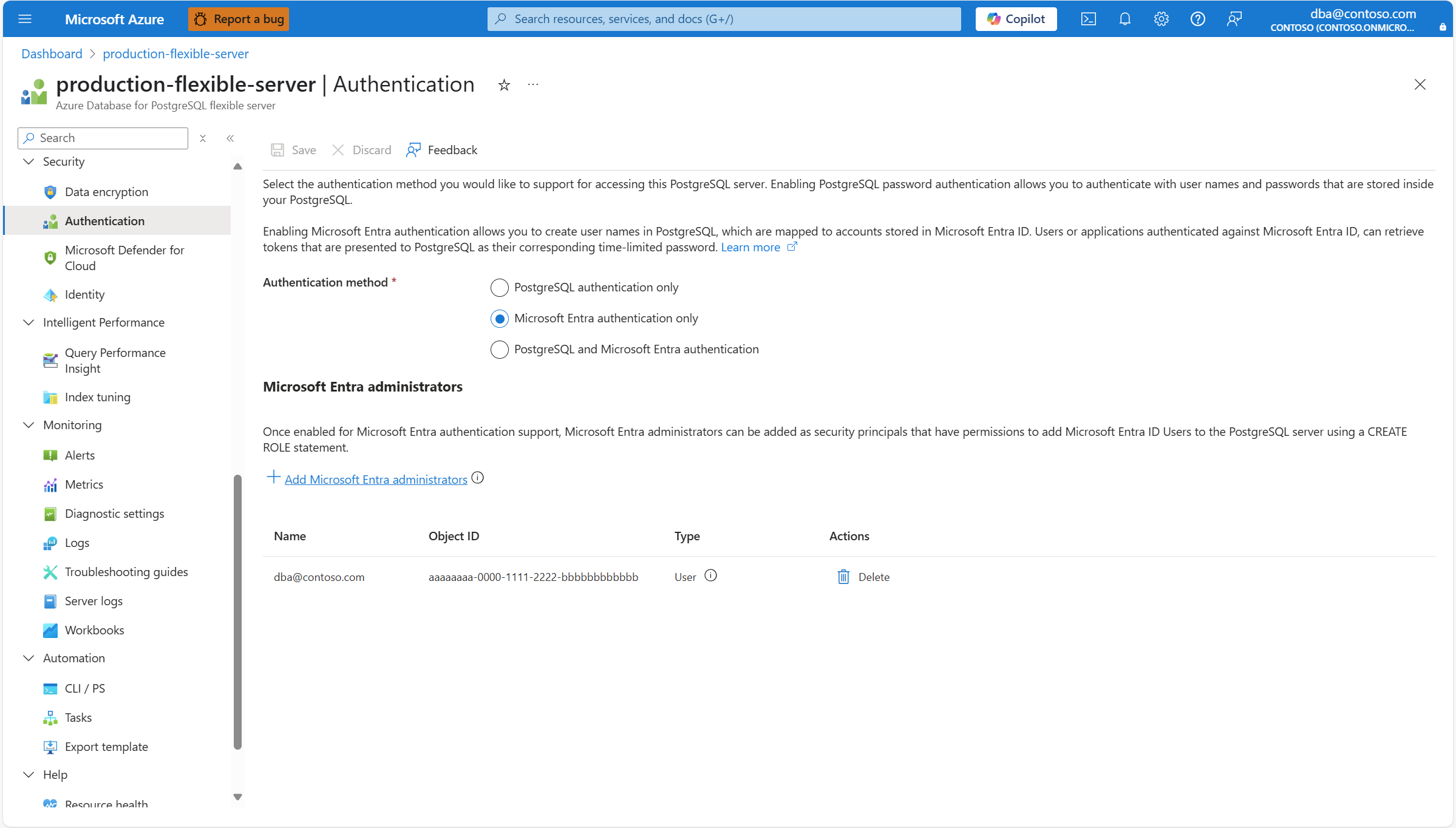 Die Authentifizierungsmethode muss entweder nur die PostgreSQL-Authentifizierung oder PostgreSQL und die Microsoft Entra-Authentifizierung sein, damit der Button "Kennwort zurücksetzen" auf der Symbolleiste aktiviert wird. Wenn sie nur für die Microsoft Entra-Authentifizierung festgelegt ist, ist die Schaltfläche " Kennwort zurücksetzen " deaktiviert.