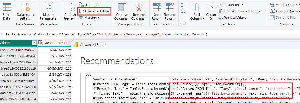 AOE enthält einen Power BI-Bericht zur Visualisierung von Empfehlungen. Um sie zu verwenden, müssen Sie zuerst die Datenquellenverbindung zu der SQL-Datenbank ändern, die Sie mit dem AOE bereitgestellt haben. Wählen Sie im oberen Power BI-Menü "Daten transformieren>Datenquelleneinstellungen" aus.