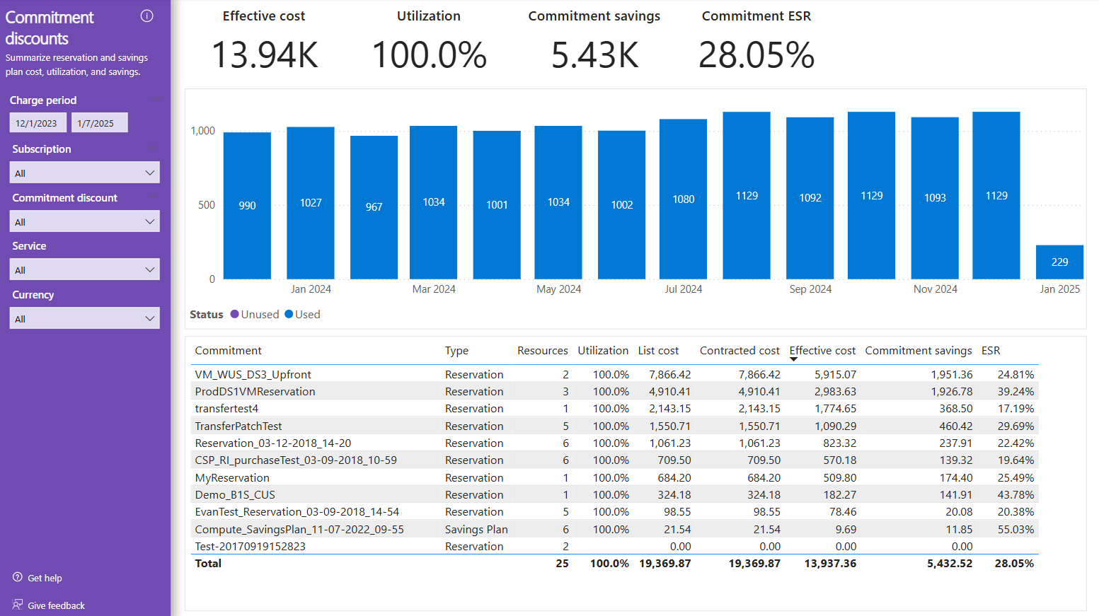 Das Diagramm zeigt die Kosten für genutzte im Vergleich zu nicht genutzten Gebühren auf. Der Verpflichtungstyp (z. B. Reservierungs- und Sparplan) teilt nicht verwendete Gebühren auf.