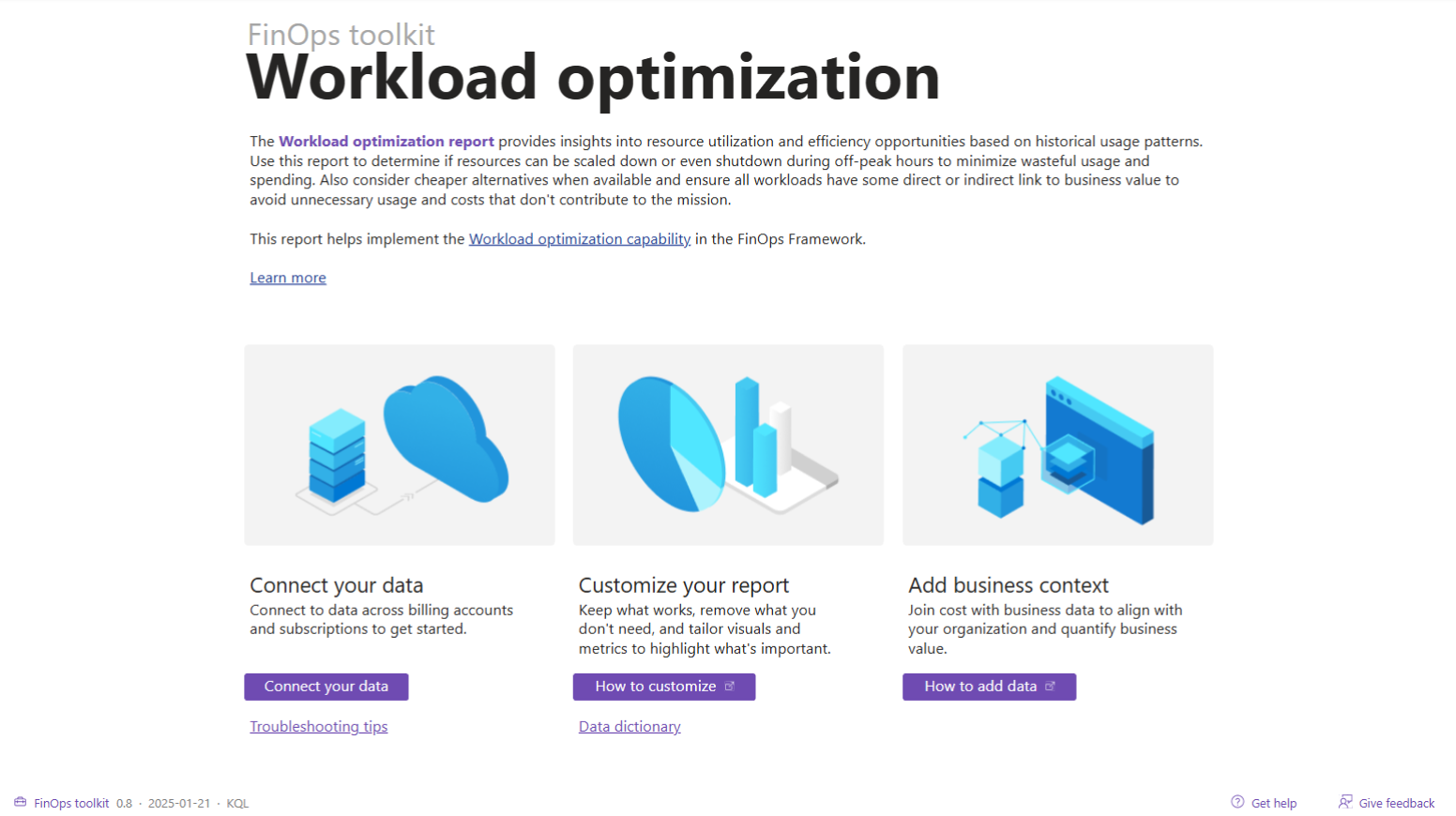 Der Workload-Optimierungsbericht ist neu und wird weiterhin entwickelt. Wir werden die Funktionen in jeder Version weiterhin in Übereinstimmung mit der Arbeitsmappe "Kostenoptimierung" erweitern. Um andere Funktionen anzufordern, erstellen Sie eine Featureanforderung in GitHub.