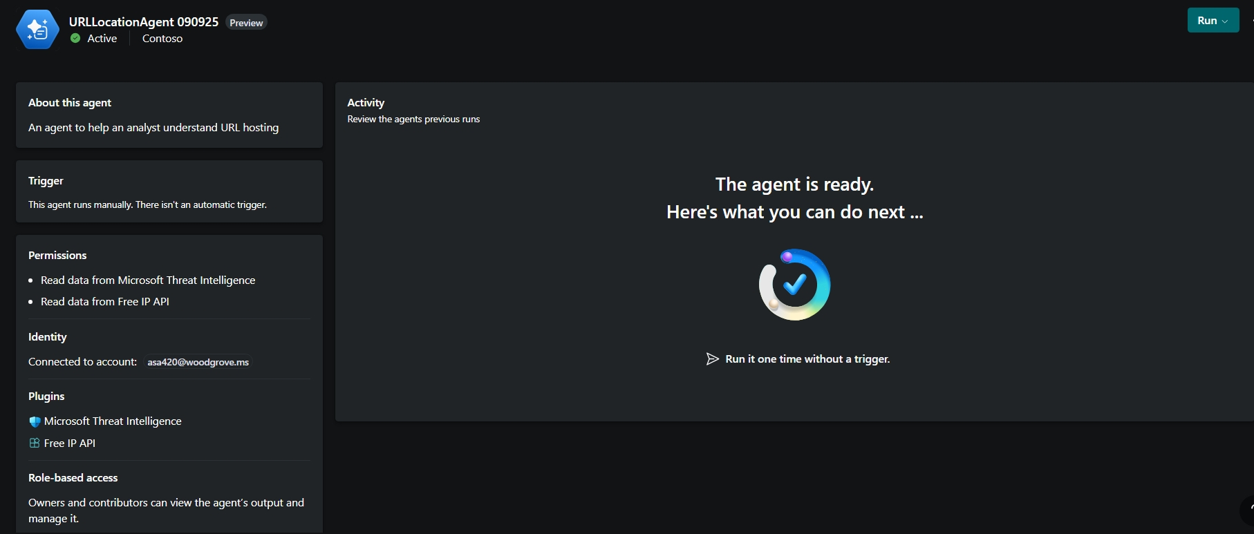 Contoso.SecurityCopilot.Samples-090925.URL_Location_DCA_Agent_Entrypoint-090925. Der Agent-Skill (Format:AGENT) untersucht den Hostingspeicherort der URL.