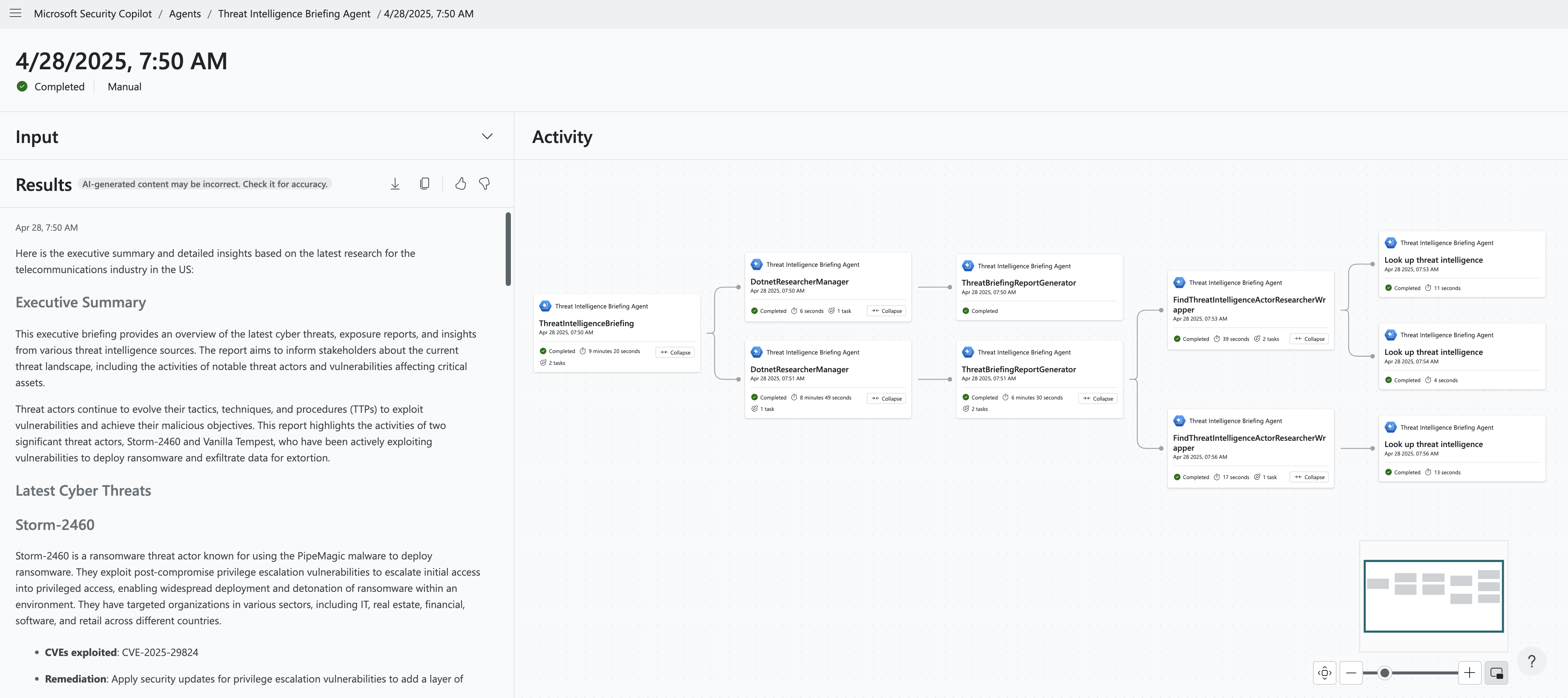Der Agent nutzt dynamische Automatisierung und umfassende generative KI sowie seine fülle an Threat Intelligence-Kenntnissen und -Signalen. Beim Erstellen des Briefings wählt der Agent dynamisch den nächsten Schritt basierend auf dem Ergebnis des vorherigen Schritts aus, sodass er in Echtzeit entscheiden kann, welche Threat Intelligence einbezogen und priorisiert werden soll. Der Agent übersetzt diese technischen Informationen dann in einen verdaulichen Bericht, der von verschiedenen Zielgruppen genutzt werden kann.