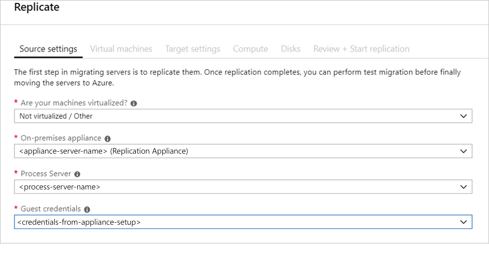 2. Wählen Sie unter Replizieren>Quelleneinstellungen>Sind Ihre Maschinen virtualisiert? die Option Physikalisch oder andere (AWS, GCP, Xen, usw.) aus.