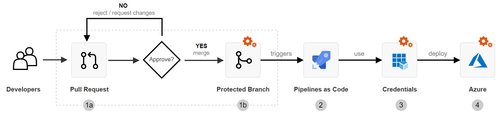 Bei der Planung Ihres End-to-End-Governance-Modells sind privilegierte Benutzer (veggies-admins) für die Konfiguration des Branch-Schutzes verantwortlich. Zu den allgemeinen Branch-Schutzmaßnahmen, die zum Sichern Ihrer Deployments verwendet werden, gehören: