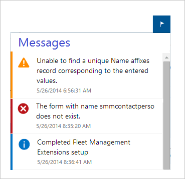 If info(), warning()/checkfailed(), or error() is called from an asynchronous process (for example, a batch), there is no form context to consider, and the messages are sent to the Action center. (To open the Action center, click the Show messages button on the navigation bar.) The following illustration shows examples of each type of message in the Action center.