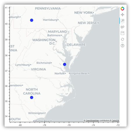 Das folgende Bild ist ein Beispiel für das Zeichnen von Glyphen auf einer Karte mithilfe von bokeh.