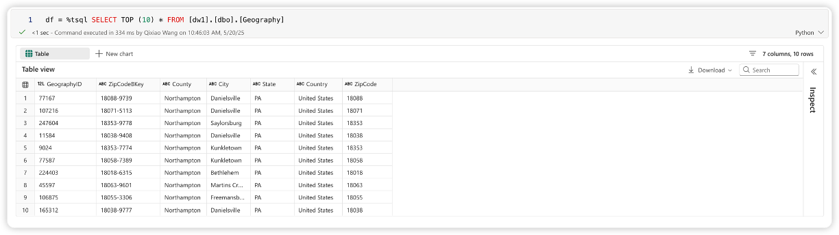 %tsqlin den folgenden Zellen verwenden. Die Funktion „Line Magic“ wird die in Schritt 1 hergestellte Verbindung verwenden, ohne dass Sie-artifactund-typeerneut angeben müssen. Beispiel:df = %tsql SELECT TOP(10) * FROM [ContosoDWH].[dbo].[Geography];