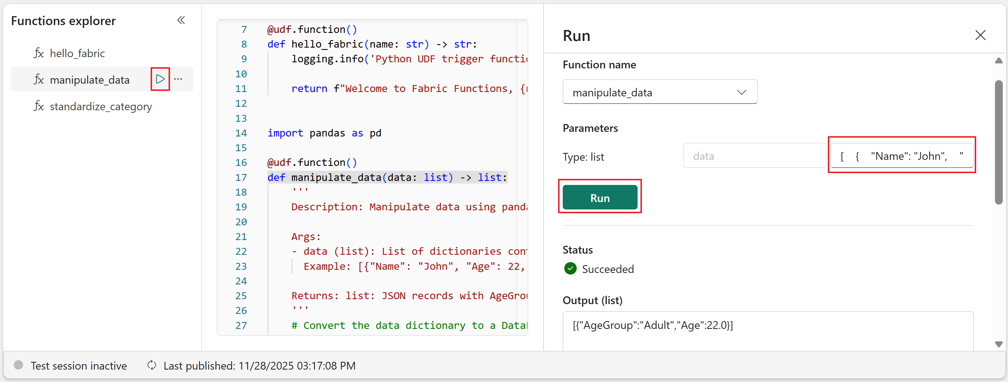 manipulate_dataFunktion.Wählen Sie die Schaltfläche "Ausführen " aus, die angezeigt wird, wenn Sie mit der Maus auf die Funktion zeigen.