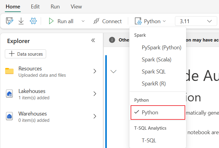 Nach dem Öffnen eines Fabric-Notizbuchs können Sie im Dropdownmenü "Sprache" auf der Registerkarte "Start" zu Python wechseln und das gesamte Notizbuch in Python konvertieren.