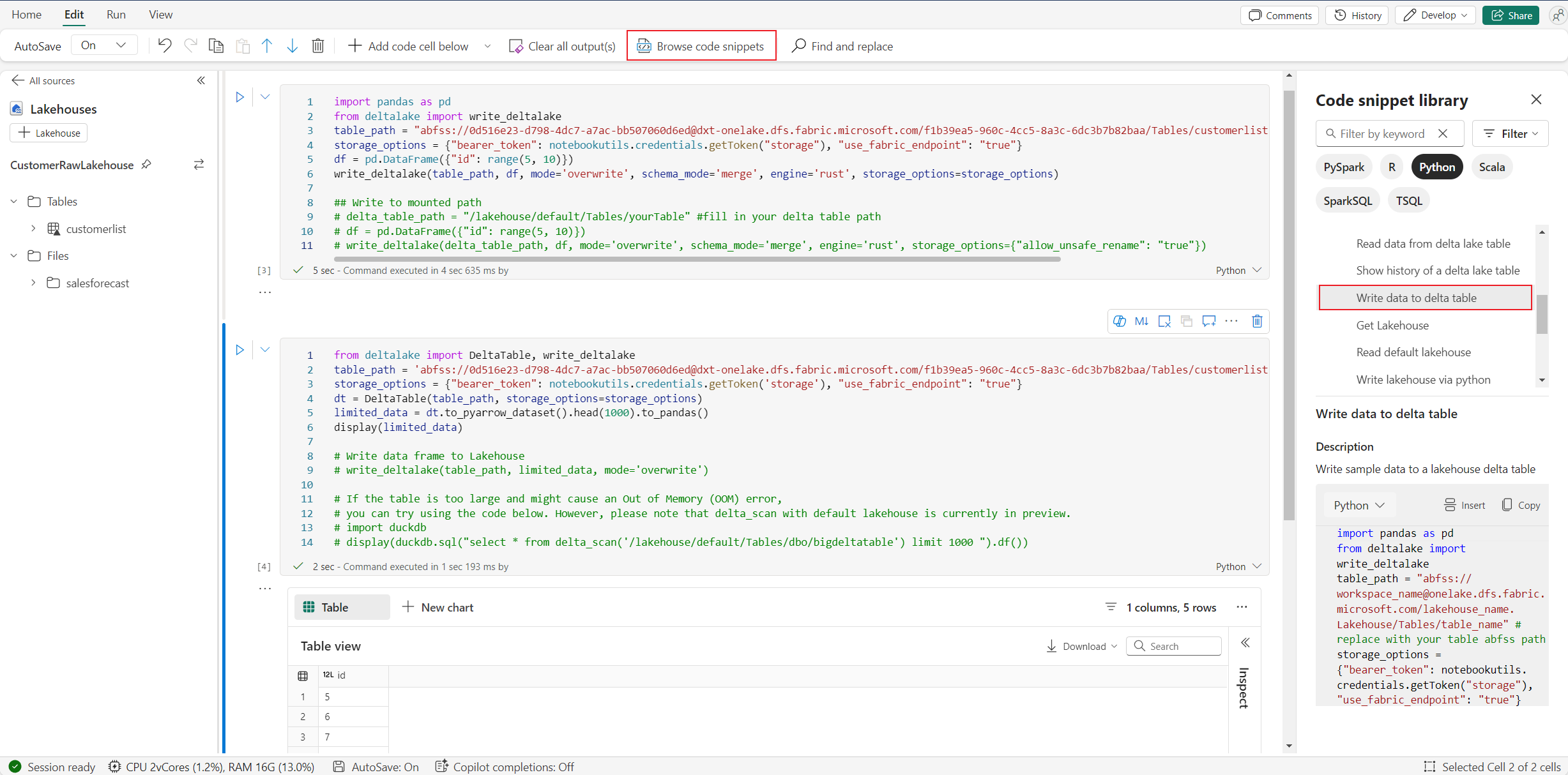 Sie finden den Lakehouse-Schreibvorgang in Durchsuchen von Codeschnipseln –>Schreiben von Daten in Delta-Tabelle.