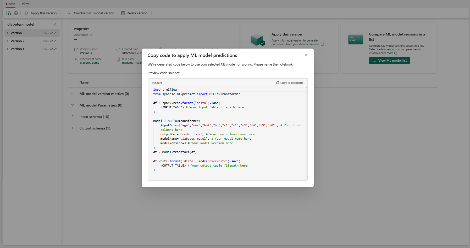 from synapse.ml.predict import MLFlowTransformer # You can substitute values below for your own input columns, # output column name, model name, and model version model = MLFlowTransformer( inputCols=test.columns, outputCol='predictions', modelName='diabetes-model', modelVersion=1 )- Geben Sie die Spalten des