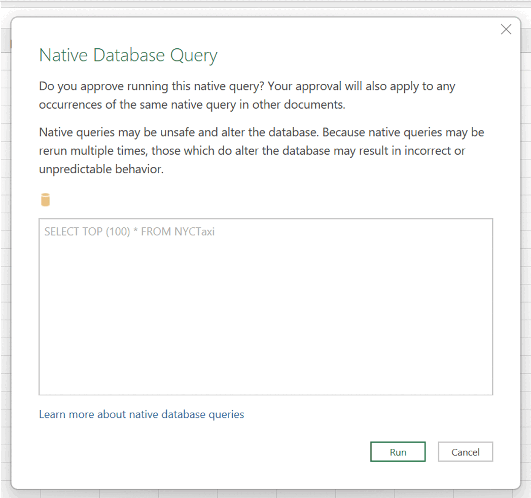 Um die Daten anzuzeigen, wählen Sie die Schaltfläche Bearbeitung aktivieren im Menüband Geschützte Ansicht gefolgt von der Schaltfläche Inhalt aktivieren im Menüband Sicherheitswarnung. Sobald beide aktiviert sind, wird ihnen das folgende Dialogfeld angezeigt, um die Ausführung der aufgelisteten Abfrage zu genehmigen.