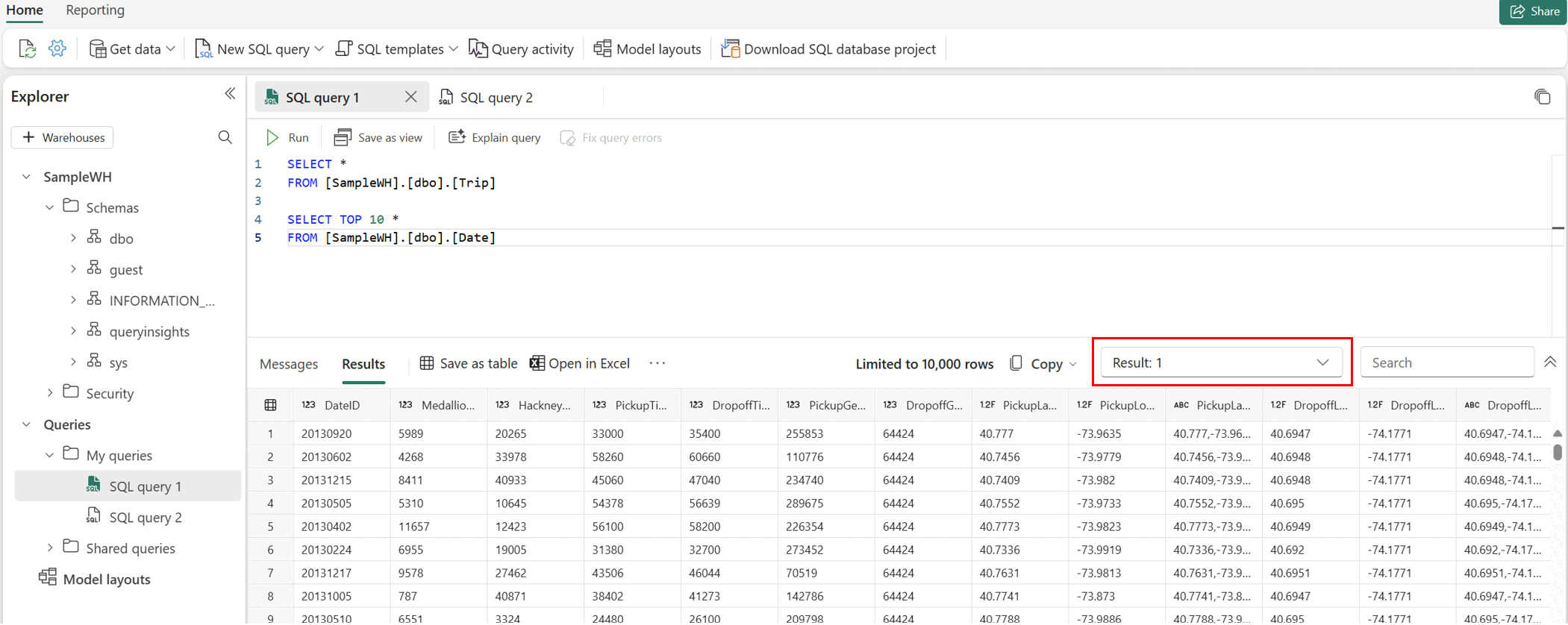 Wenn Sie mehrere Abfragen ausführen und diese Abfragen mehrere Ergebnisse zurückgeben, können Sie die Dropdownliste " Ergebnisse " auswählen, um einzelne Ergebnisse anzuzeigen.