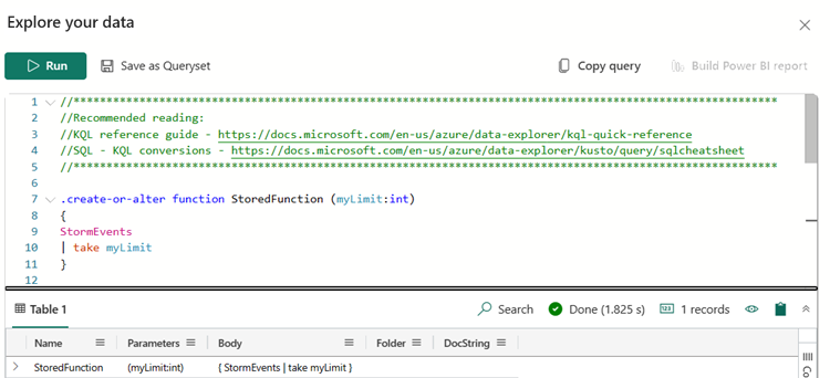 Weitere Informationen zum .create-or-alterfunction Befehl finden Sie unter .create-or-alter function.